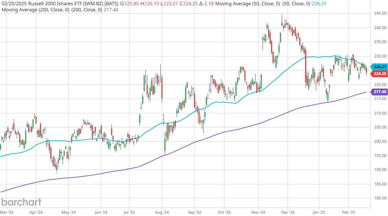 The Dow Jones Industrial Average ($DOWI) is leading today’s sell-off after a bleak forecast from Walmart (WMT), but fears over the state of the U.S. consumer are also weighing heavily on small-cap stocks. The iShares Russell 2000 ETF (IWM) is down about 1% this afternoon, retreating from a test of its overhead 50-day moving average.