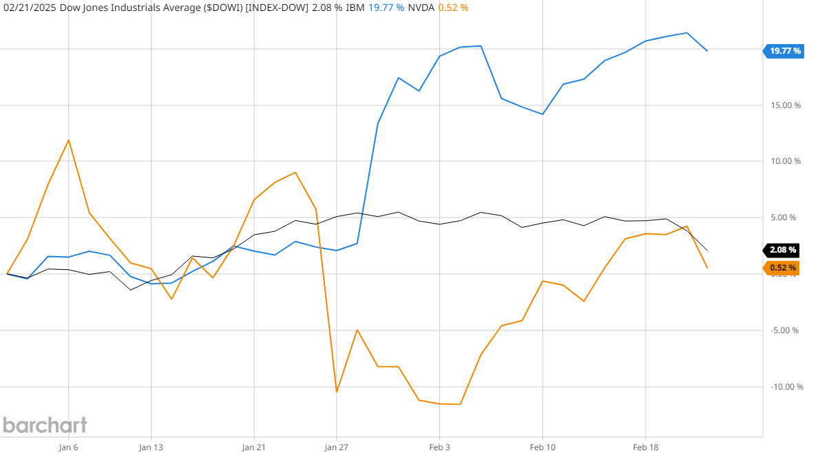 IBM stock has demonstrated remarkable resilience in early 2025, achieving a 19% year-to-date gain and outperforming many of its technology sector peers - including Dow giant Nvidia (NVDA), which is roughly flat on the year.