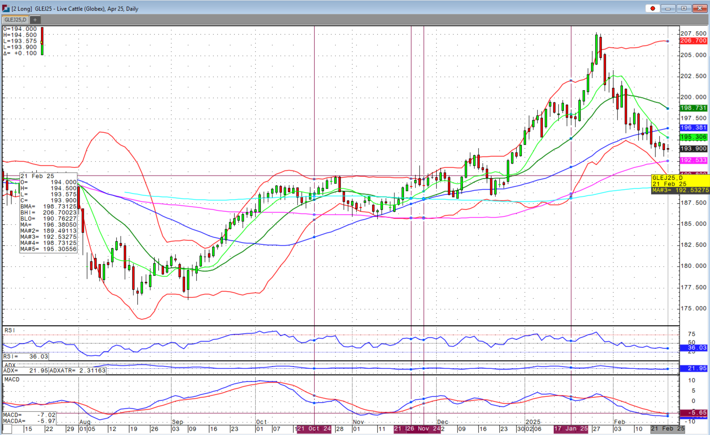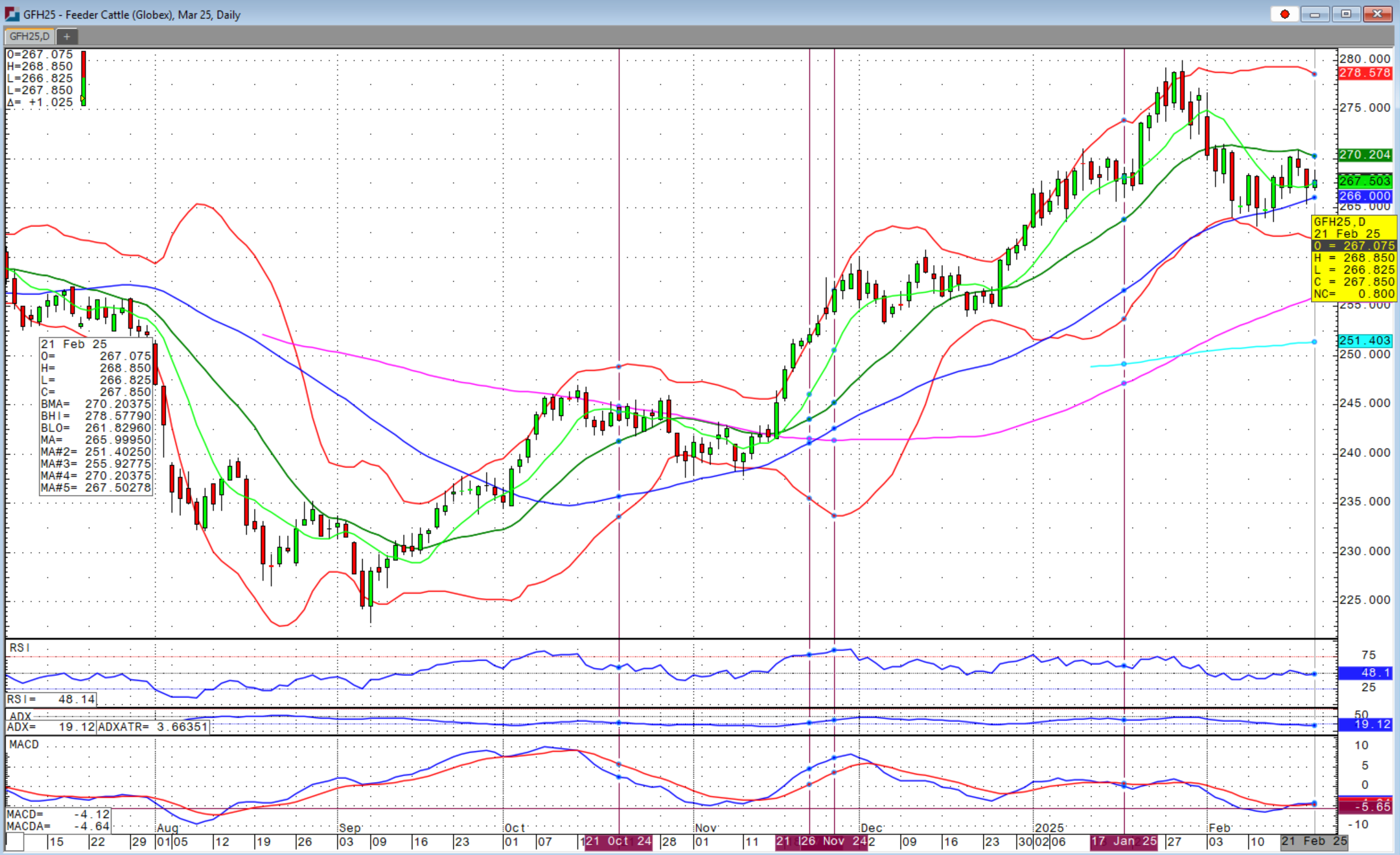 The cattle complex had a sideways to weaker tone this week while lean hogs underwent massive liquidation selling. The sideways congestion was in feeder cattle contracts while the fed cattle futures were lower, largely from last Friday’s selloff. Spring feeder contracts are holding the 50-day moving average so far. If we start getting closes below this level, we will probably see another $8-10 per cwt slippage in feeder futures. October and further out feeder contracts are showing much greater signs of strength closing above their respective 20-day moving averages on Friday.