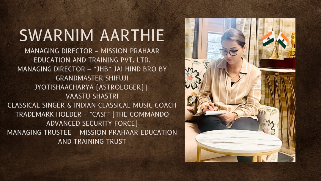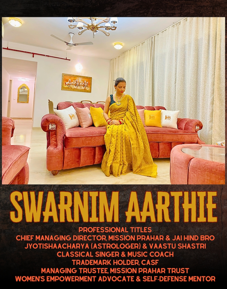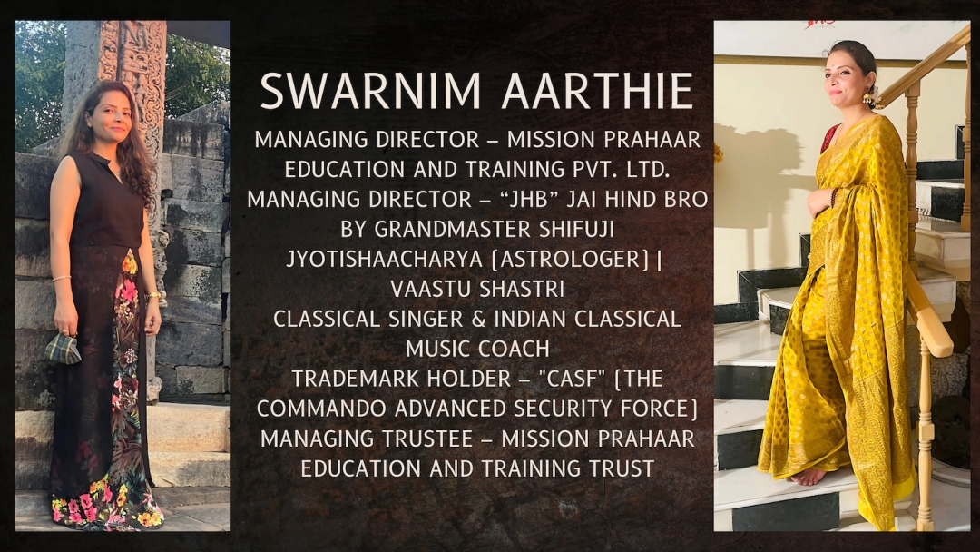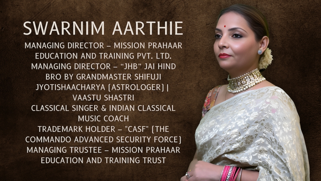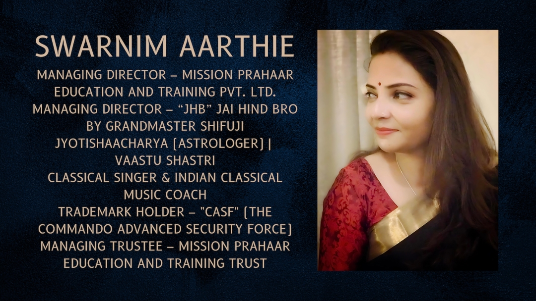 Swarnim Aarthie stands as a pillar of strength and excellence. Her contributions to astrology, classical music, self-defense training, and security initiatives make her a distinguished figure. She continues to shape the future alongside Grandmaster Shifuji, inspiring generations with her knowledge, discipline, and nationalistic spirit. Her work is a testament to Indian culture, security, and progress, ensuring that Mission Prahar, Jai Hind Bro, and other initiatives continue to thrive.