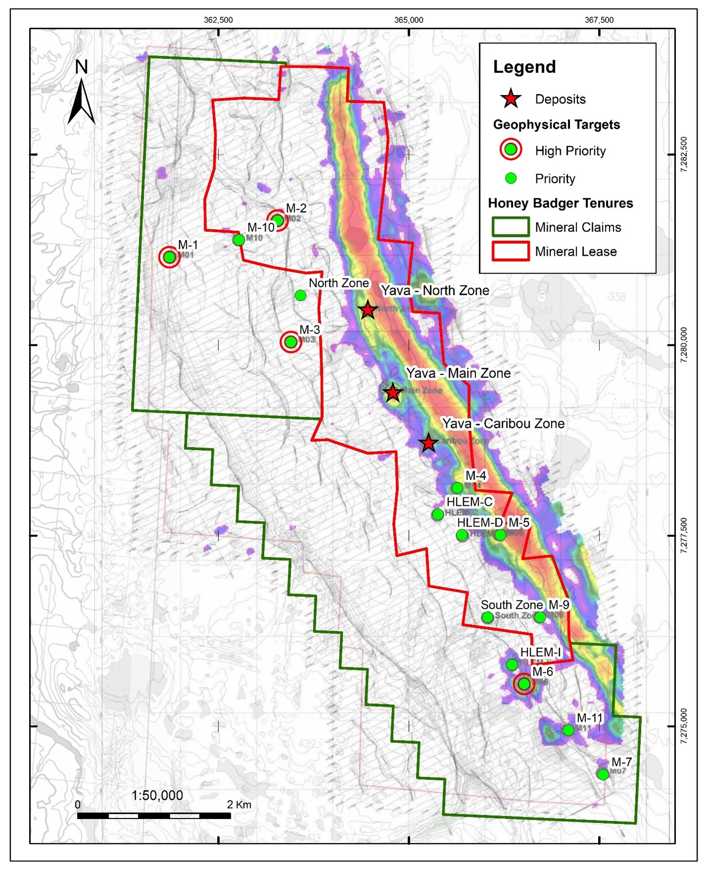 Figure 2. High and low priority geophysical targets on the Yava Main Zone claim/lease block.