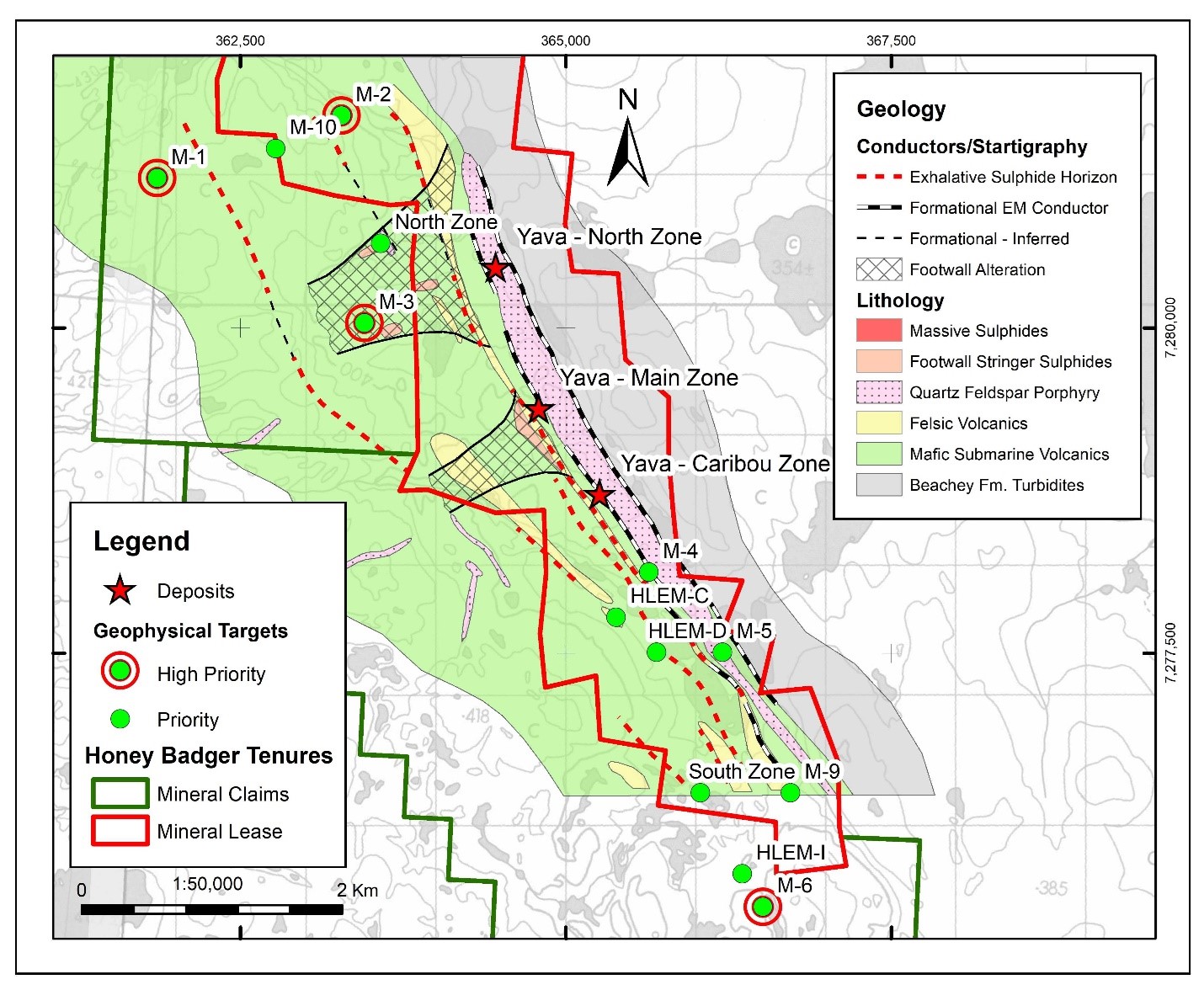 Another sample, collected in 2004, located 650 m north of the M-3 target/conductor, comprised sulphide-rich mineralization that was later named the Yava North Zone and returned analytical values of 0.17 ppm Au and 3,452 ppm Ag* (see Figure 3). Geological evidence suggests that the silver-rich sulphide mineralization at the M-3 and Yava North zones represent part of a significant volcanogenic massive sulphide (VMS) footwall stringer zone that appears to be a northwestern projection of the Yava Main Zone mineralized horizon. This second mineralized system on the main Yava claim/lease block, along with the remainder of the strike extent of the Yava Main Zone mineralized horizon, represents an additional priority for future exploration at the property.