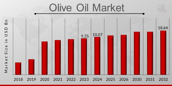 The Olive Oil Market was valued at USD 9.35 billion in 2023 and is expected to grow from USD 10.07 billion in 2024 to USD 18.64 billion by 2032, reflecting a compound annual growth rate (CAGR) of 7.99% during the forecast period (2024–2032).