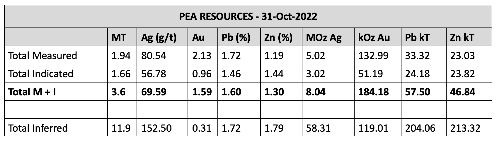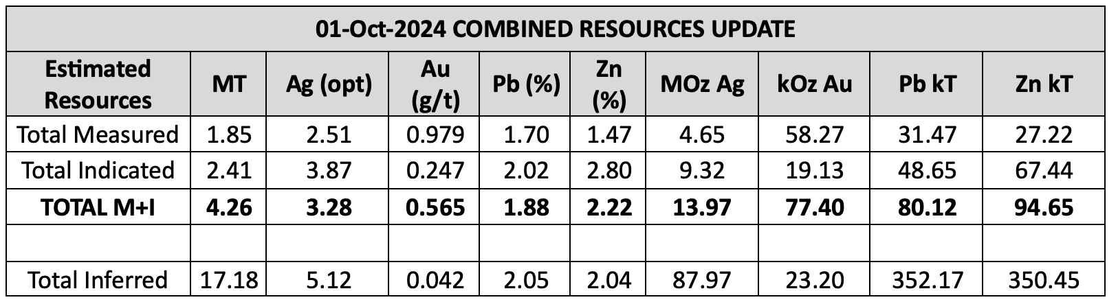 Recoverable inferred resources of 5.394 MT at 4.82 opt Ag, 3.35% Zn, and 1.98% Pb.