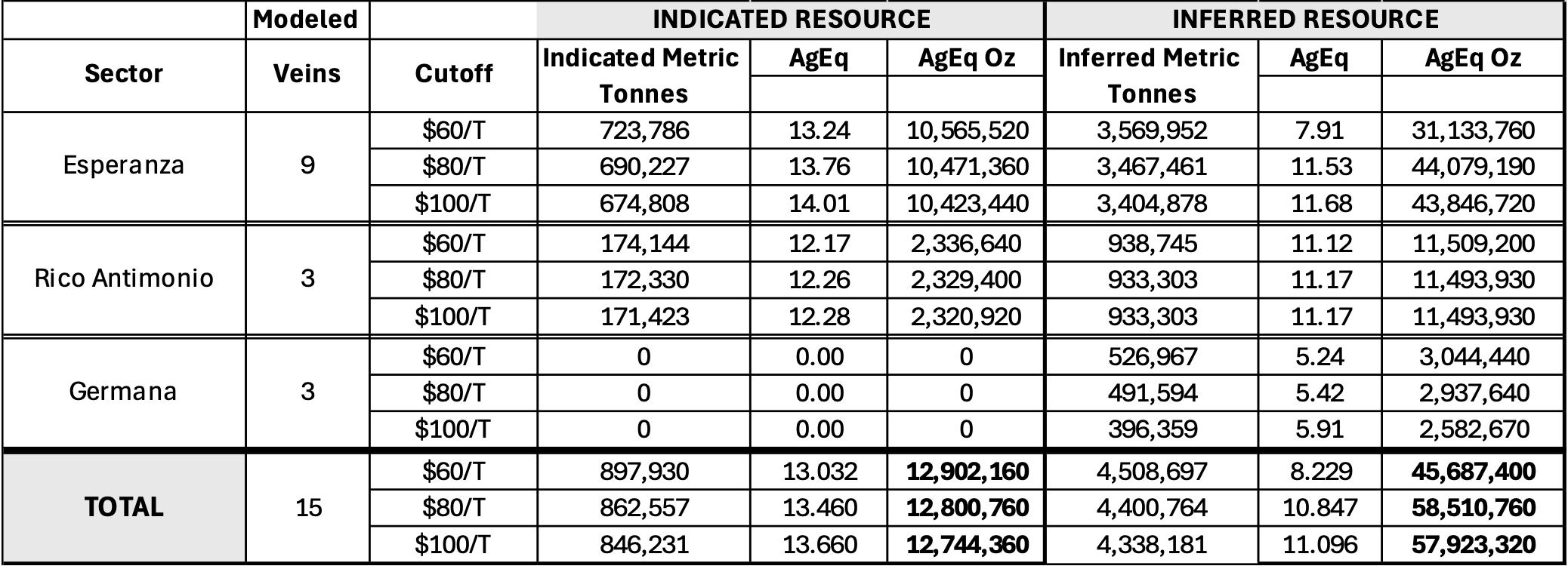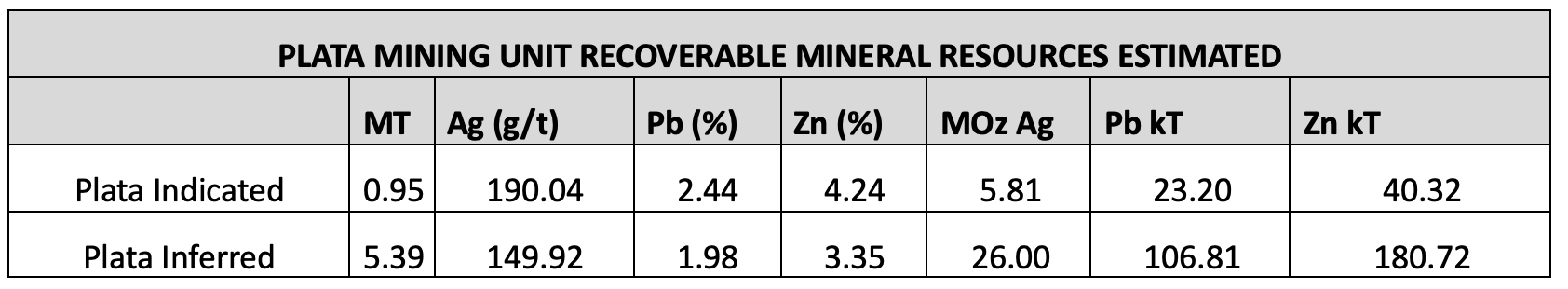 Contained Silver: Contained silver resources for the Plata Mining Unit now stands at 5.81 Moz Indicated and 26.00 Moz Inferred.