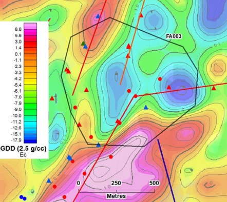 Figure 6. Target FA010 with data from the 2022 airborne gravity survey flown by Xcalibur Airborne Geophysics. Dark contour lines at 10 Eö intervals.