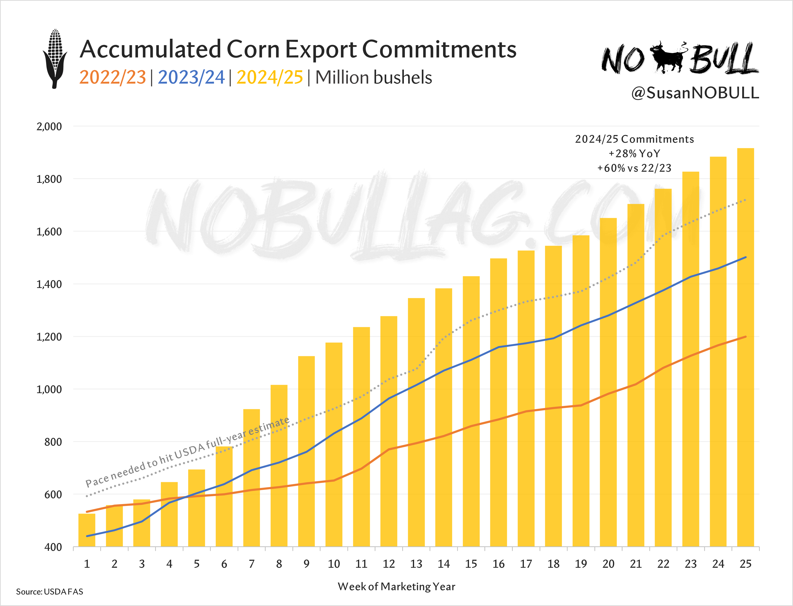 Corn export sales remain strong, with total 2024/25 commitments surpassing 1.9 billion bushels in the week ending February 20, up 28% year-on-year and 60% higher than this point in 2022/23.