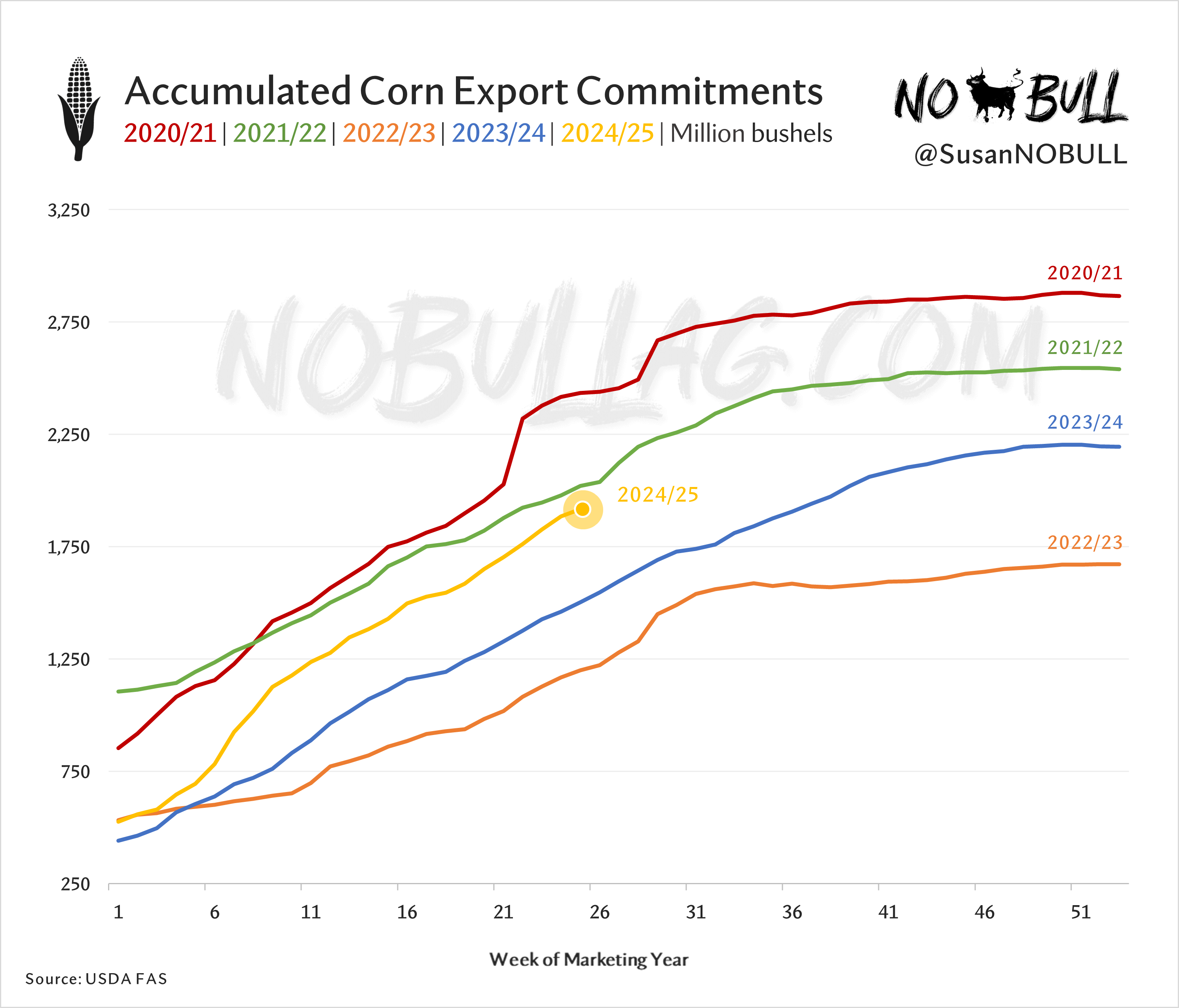 Cumulative commitments continue to exceed the pace needed to hit USDA’s current 2.45 billion bushel full-year estimate by nearly 200 million bushels.