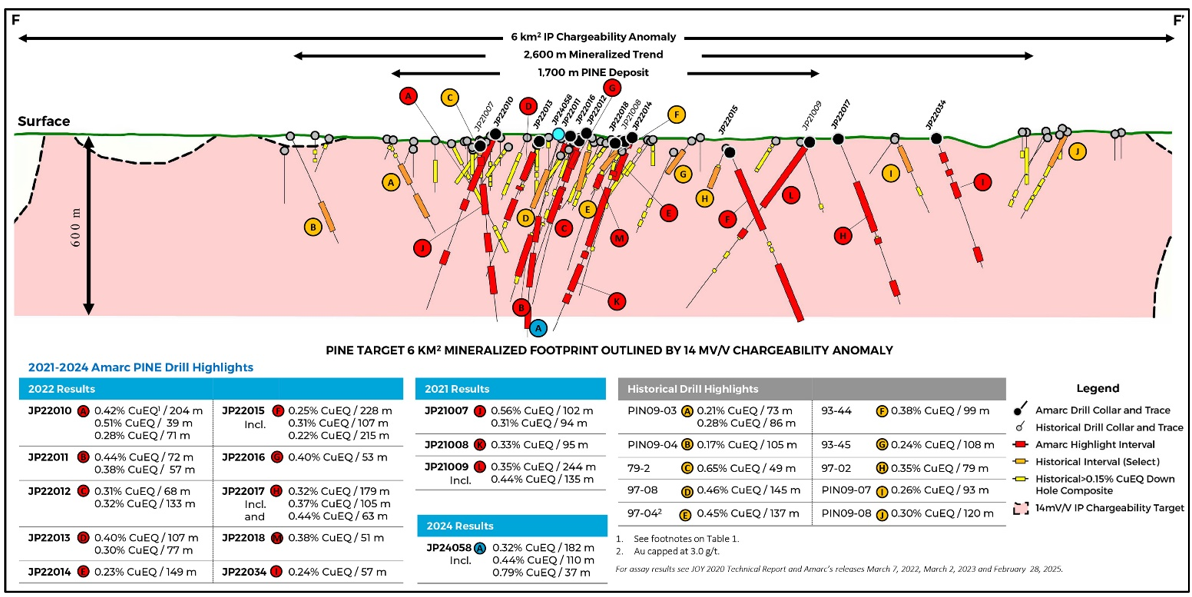 Drillhole JP24080 on section 7700N at AuRORA returned 132 m of 1.71% CuEQ with 1.87 g/t Au, 0.63% Cu and 5.2 g/t Ag from 137 m, including 90 m of 2.26% CuEQ with 2.53 g/t Au, 0.81% Cu and 6.5 g/t Ag from 167 m, and 24 m of 4.17% CuEQ with 4.95 g/t Au, 1.35% Cu and 10.8 g/t Ag from 215 m (Table 1, and Table 5 which provides sample by sample results in holes JP24080 and JP24083 to show the continuity of the grades within these holes). Additionally, drillhole JP24017 crosses this section and intersected 108 m with 1.96% CuEQ at 2.38 g/t Au, 0.60% Cu and 5.17 g/t Agfrom 104 m within a longer interval extending from near surface, as previously reported (see Amarc January 17, 2025 release). Mineralization remains open to expansion east-west along the section (Figures 2 and 3). This section stepped out 100 m to the south of Section 7800N where previously reported drillhole JP24059 returned an outstanding 171 m with 1.09% CuEQ at 1.32 g/t Au, 0.34% Cu, 2.6 g/t Ag from 24 m and JP24074 returned 162 m with 1.90% CuEQ at 2.19 g/t Au, 0.63% Cu, 7.0 g/t Ag from 69 m (see Amarc release January 17, 2025).