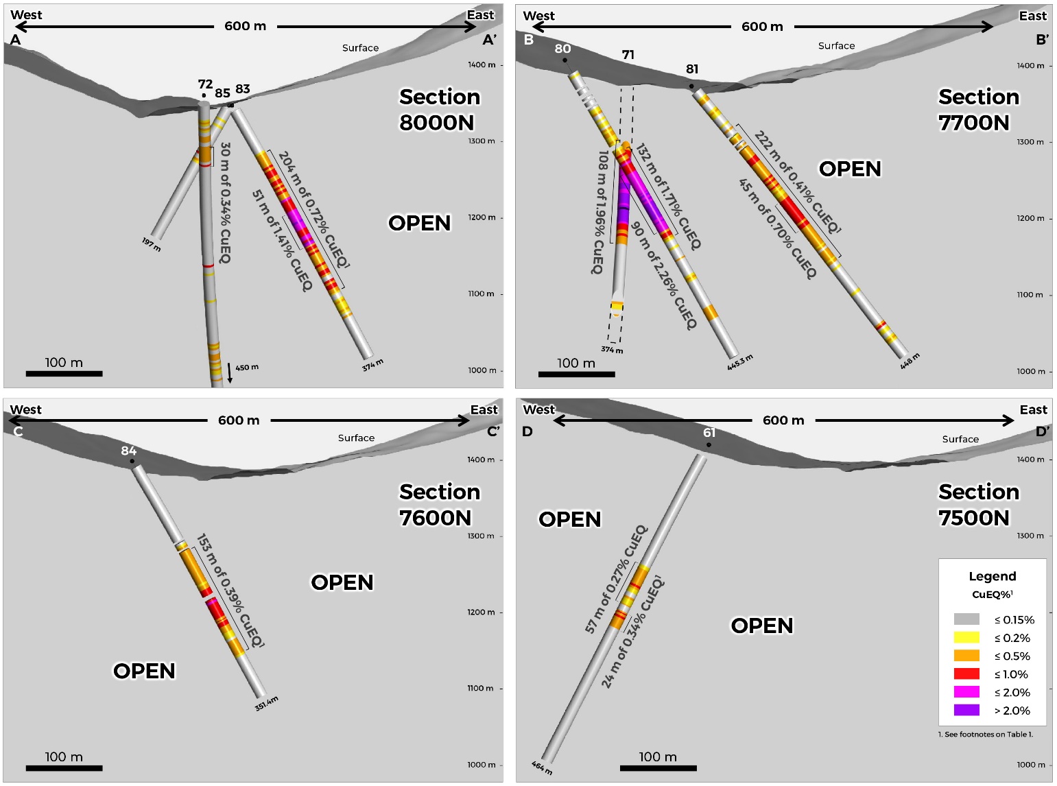Figure 3: AuRORA Deposit: High Grade, Near Surface, Cu-Au-Ag Mineralization, Open to Expansion (Sections 8000N, 7700N, 7600N and 7500N)