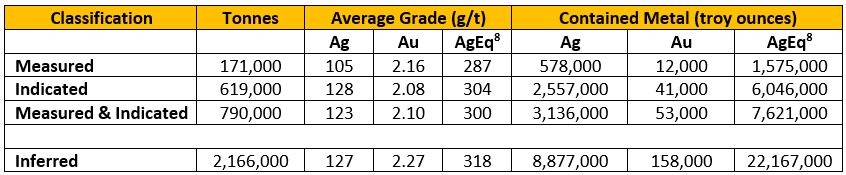 The 2023 MRE comprises Measured and Indicated Mineral Resources of 7.621 million ("M") troy ounces ("oz") AgEqii at 300 g/t AgEqii within 0.79M tonnes (t), and Inferred Resources of 22.167M oz AgEqii at 318 g/t AgEqii within 2.166M tonnes. These figures represent increases in contained metals of approximately 4.318M oz AgEqii in the Measured and Indicated category (130% increase), and 16.385M oz AgEqii in the Inferred category (283% increase) versus the previously reported historical resource estimatei. The 2023 MRE for the San Ignacio mine is presented in Table 1 below.