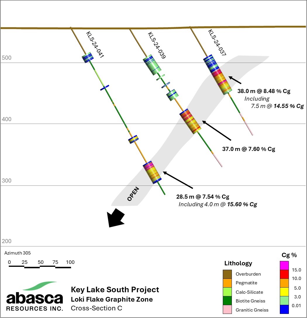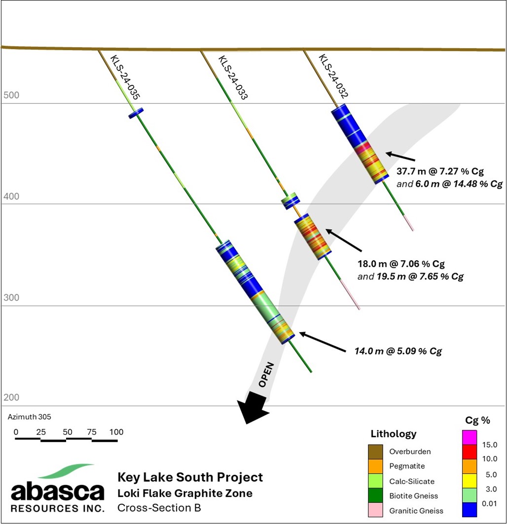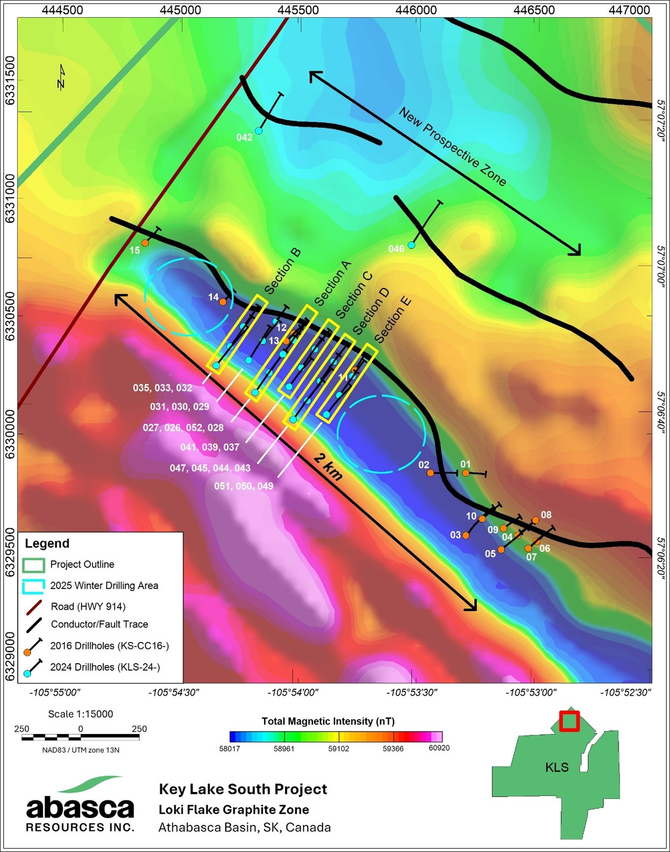 SASKATOON, SK / ACCESS Newswire / March 3, 2025 / Abasca Resources Inc. ("Abasca" or the "Company") (TSXV:ABA.VN) is pleased to release assay results of the remaining fourteen drillholes at its Loki Flake Graphite Zone (Loki Zone) from its 2024 summer exploration program at its 100%-owned Key Lake South (KLS) Project (Figure 1; For the assay results of the first six drillholes, see the Company's news release dated November 27, 2024). The twenty drillholes totaling 5,499 m were designed at a 100 m x 100 m grid spacing to delineate a 600 m section of the Loki Zone. The Loki Zone remains open along strike and at depth. The 2025 winter drill program is underway to continue the delineation of this emerging 2 km graphite zone (Figure 2). Locations and orientations of drillholes included in this release are listed in Table 1 and their assay results are shown in Table 2.