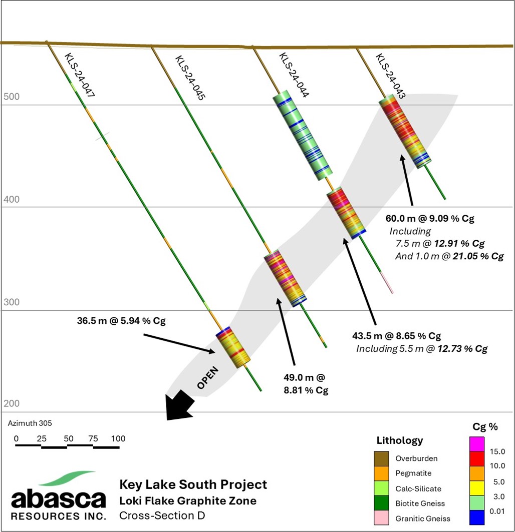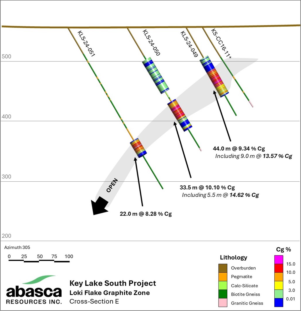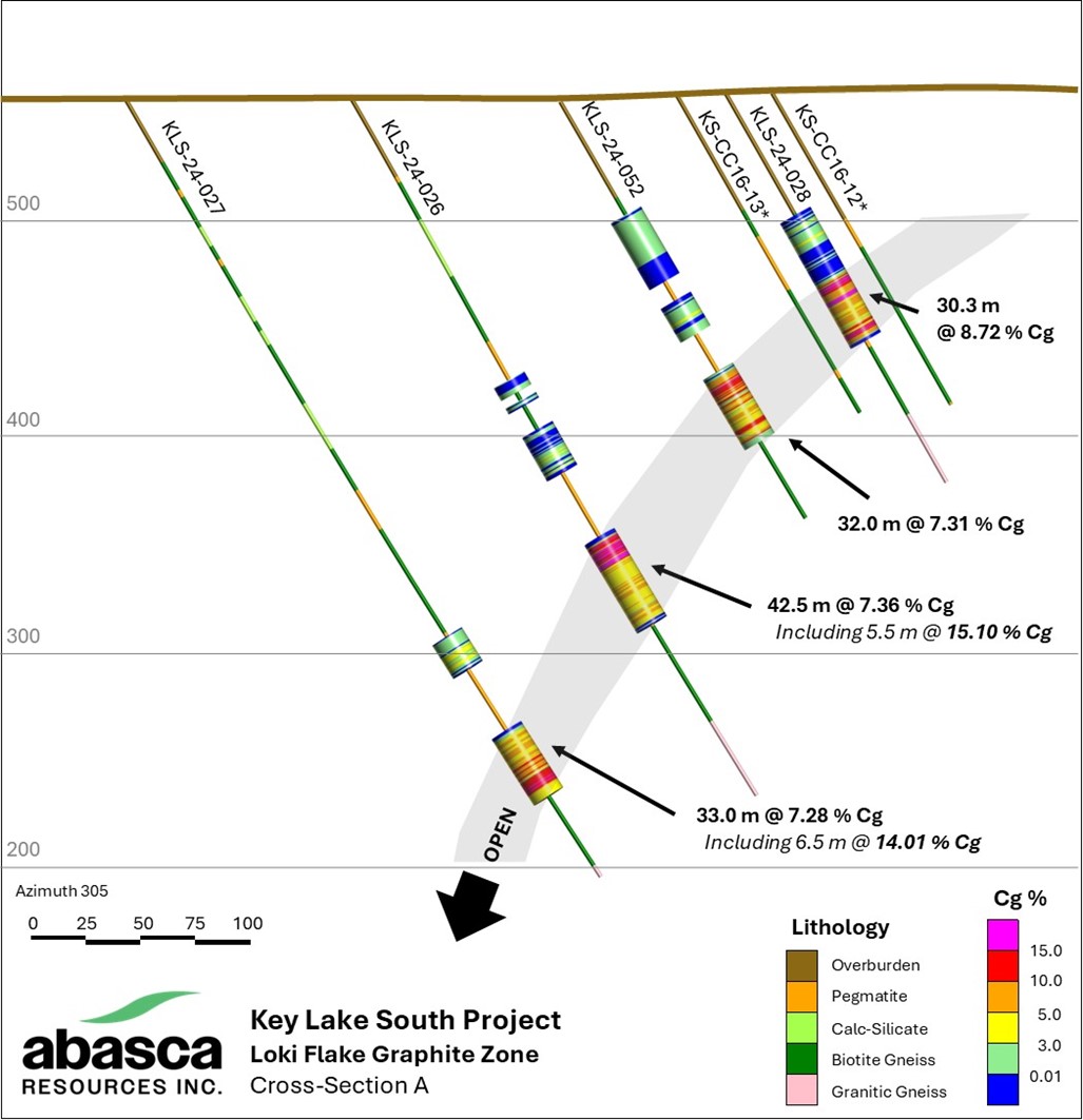 SASKATOON, SK / ACCESS Newswire / March 3, 2025 / Abasca Resources Inc. ("Abasca" or the "Company") (TSXV:ABA.VN) is pleased to release assay results of the remaining fourteen drillholes at its Loki Flake Graphite Zone (Loki Zone) from its 2024 summer exploration program at its 100%-owned Key Lake South (KLS) Project (Figure 1; For the assay results of the first six drillholes, see the Company's news release dated November 27, 2024). The twenty drillholes totaling 5,499 m were designed at a 100 m x 100 m grid spacing to delineate a 600 m section of the Loki Zone. The Loki Zone remains open along strike and at depth. The 2025 winter drill program is underway to continue the delineation of this emerging 2 km graphite zone (Figure 2). Locations and orientations of drillholes included in this release are listed in Table 1 and their assay results are shown in Table 2.