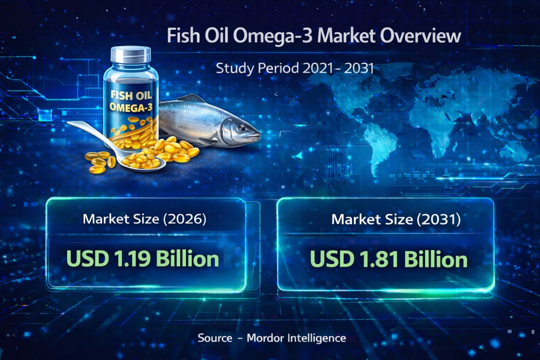 The global fish oil omega-3 market size is projected to increase from USD 1.19 billion in 2026 to USD 1.81 billion by 2031, registering a strong CAGR of 8.7% during the forecast period. The latest fish oil omega-3 market forecast reflects rising demand for high-purity EPA and DHA concentrates, expanding applications in infant nutrition, and growing awareness of cardiovascular and cognitive health benefits.