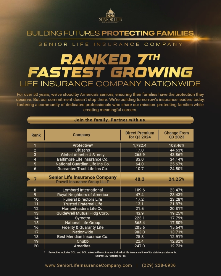 THOMASVILLE, GA - March 05, 2025 - Senior Life Insurance Company, a leading provider of final expense life insurance, has been recognized as the 7th fastest-growing life insurance company in America for Q3, 2024. This ranking places Senior Life ahead of major industry players such as Chubb and Nationwide, among more than 700 life insurance companies operating in the United States.