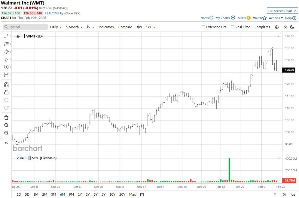 Walmart (WMT) stock is in focus today after the retail behemoth reported market-beating financials for its Q4 as the share of e-commerce sales climbed to a record 23% of its overall sales. And while WMT issued conservative guidance for the full year due to “some pressure on the lowest income cohort,” options traders remain convinced the company’s share price will push higher in 2026.