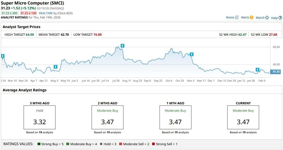 The consensus rating on SMCI currently sits at “Moderate Buy,” with the mean target of roughly $43 indicating potential upside of another 35% from here.