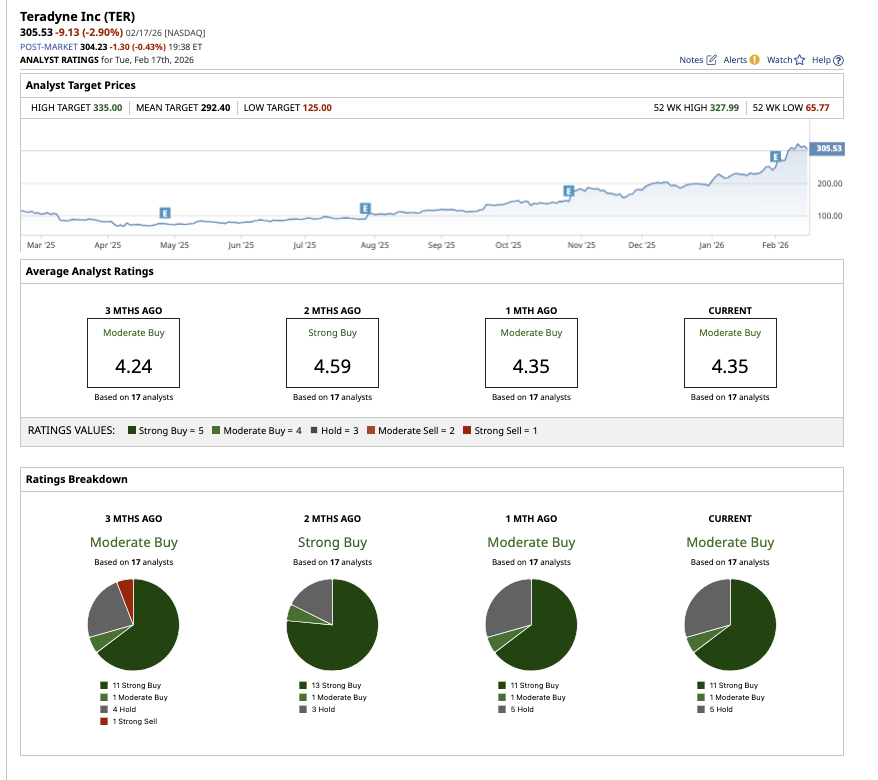 Overall, analysts also remain optimistic about Teradyne’s long-term potential, with an overall “Moderate Buy” consensus rating. Of the 17 analysts covering TER stock, 11 rate it a “Strong Buy,” one has a “Moderate Buy,” and five have a “Hold" rating. TER stock has surpassed its average target price of $292.40. However, the Street-high estimate of $335 implies that the stock can climb 7% from current levels.