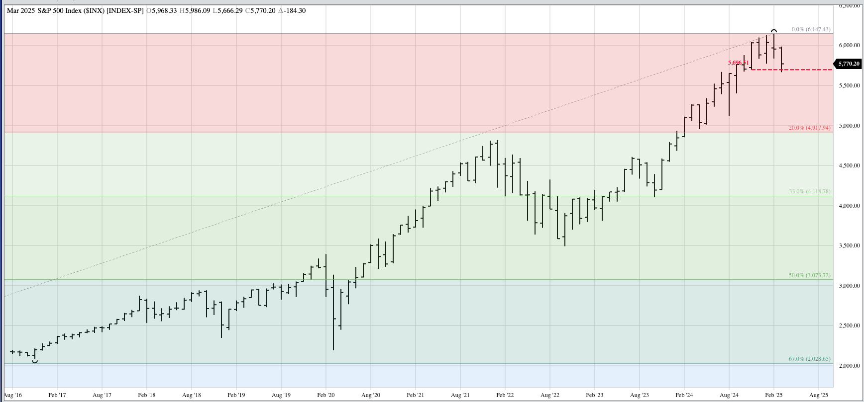 There is a lot going on with US stock indexes in general, the S&P 500 index ($INX) in particular, as we near the midpoint of March. Last week saw the S&P fall to a low of 5,666.29, taking out its previous 4-month mark of 5,696.51 from last November. From a technical point of view, this would confirm the index has moved into a major long-term downtrend. The previous uptrend began with the bullish spike reversal back in October 2022, starting with the low of 3,491.58 and running through the February 2025 high of 6,147.43. What should we make of this?