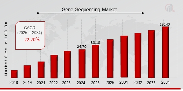As per MRFR analysis, the Gene Sequencing Market Size was estimated at 24.70 (USD Billion) in 2024. The Gene Sequencing Market Industry is expected to grow from 30.13 (USD Billion) in 2025 to 180.43 (USD Billion) till 2034, at a CAGR (growth rate) is expected to be around 22.00% during the forecast period (2025 - 2034).