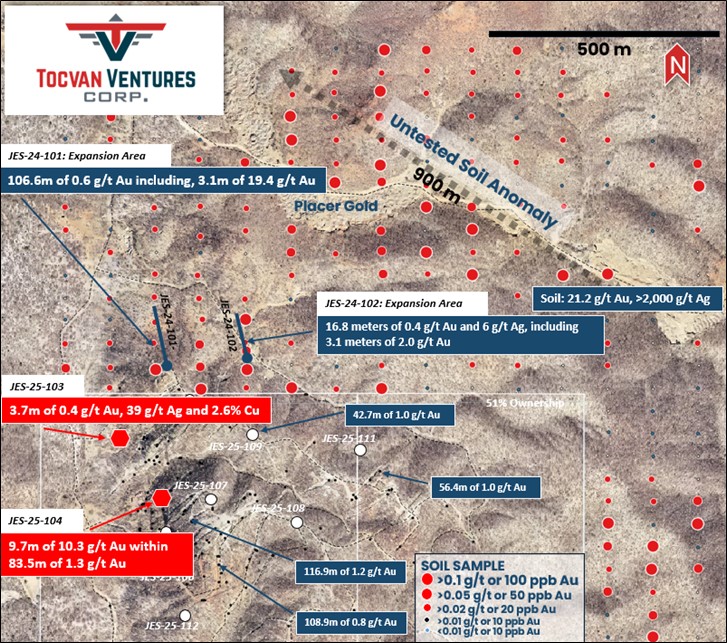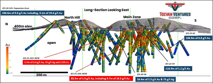 CALGARY, AB / ACCESS Newswire / March 11, 2025 / Tocvan Ventures Corp. (the "Company") (CNSX:TOC.CN)(OTC-BB:TCVNF)(WKN:TV3/A2PE64), is pleased to announce results from the first two core holes recently drilled at the Gran Pilar Gold Silver Project in mine-friendly Sonora, Mexico. Ten core drillholes totaling 1,167.5 meters were completed earlier this year within the majority owned (51%) Main Zone held in partnership with Colibri Resource Corp. Results are highlighted by 10.3 g/t Au over 9.7m, including 60.6 g/t Au over 1.6 meters starting at 87.8 meters vertical depth (JES-25-104). The high-grade mineralization correlates with at surface mineralization and lies within a broader anomalous zone drilled that averages 1.3 g/t Au over 83.5 meters from 14.1 meters below surface. In 2023, a trench exposed material adjacent to the drill hole that averaged 1.9 g/t Au and 9 g/t Ag over 14m. Material from the trench was used in the 2023 Bulk Sample completed by Tocvan. JES-25-104 is also on the same section as RC hole, JES-20-36 (24.4m of 2.5 g/t Au and 73 g/t Ag, including 1.5 m of 33.4 g/t Au and 1,090 g/t Ag) and later core hole JES-22-58 (21.7m of 0.9 g/t Au, including 4.0m of 4.2 g/t Au). The highest-grade mineralization intersected is related to a fault structure known to host high grade gold and silver. The result is the highest gold value recorded since initial discovery drilling was completed in 1996 by Lundin controlled company, Santa Catalina Mining Corp., where historic hole S-10 returned 53 g/t Au over 16.5 meters (*as reported July 30, 1996 by Santa Catalina Ming Corp.). Further to the northwest, 145 meters, core hole JES-25-103, returned anomalous gold, silver and copper averaging 0.1 g/t Au, 8 g/t Ag and 0.54% Cu over 34.7 meters starting from 19.7 meters downhole. A higher grade zone averages 3.7 meters of 0.4 g/t Au, 39 g/t Ag and 2.6% Cu. Elevated copper values are consistent with results recorded in the North Hill area and seen in trench exposures that may be related to granitoid intrusive rocks first recorded in recent RC drilling further north.