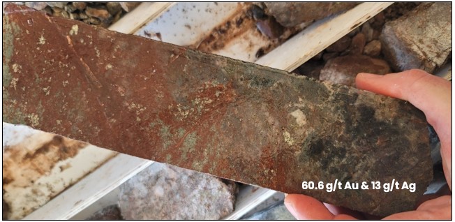 Photo 1. Close up of high-grade gold sample (JES-25-104, 1.6 meters of 60.6 g/t Au and 13 g/t Ag, from 87.8m depth vertically from surface). Local faulting and associated intense hematite and silica alteration have replaced the original andesite host rock. This style of mineralization has been recorded across the Main Zone at surface and in drill core.