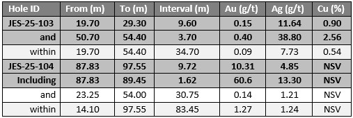 Northwestern Hole JES-25-103, returns 3.7 meters of 0.4 g/t Au, 39 g/t Ag and 2.6% Cu