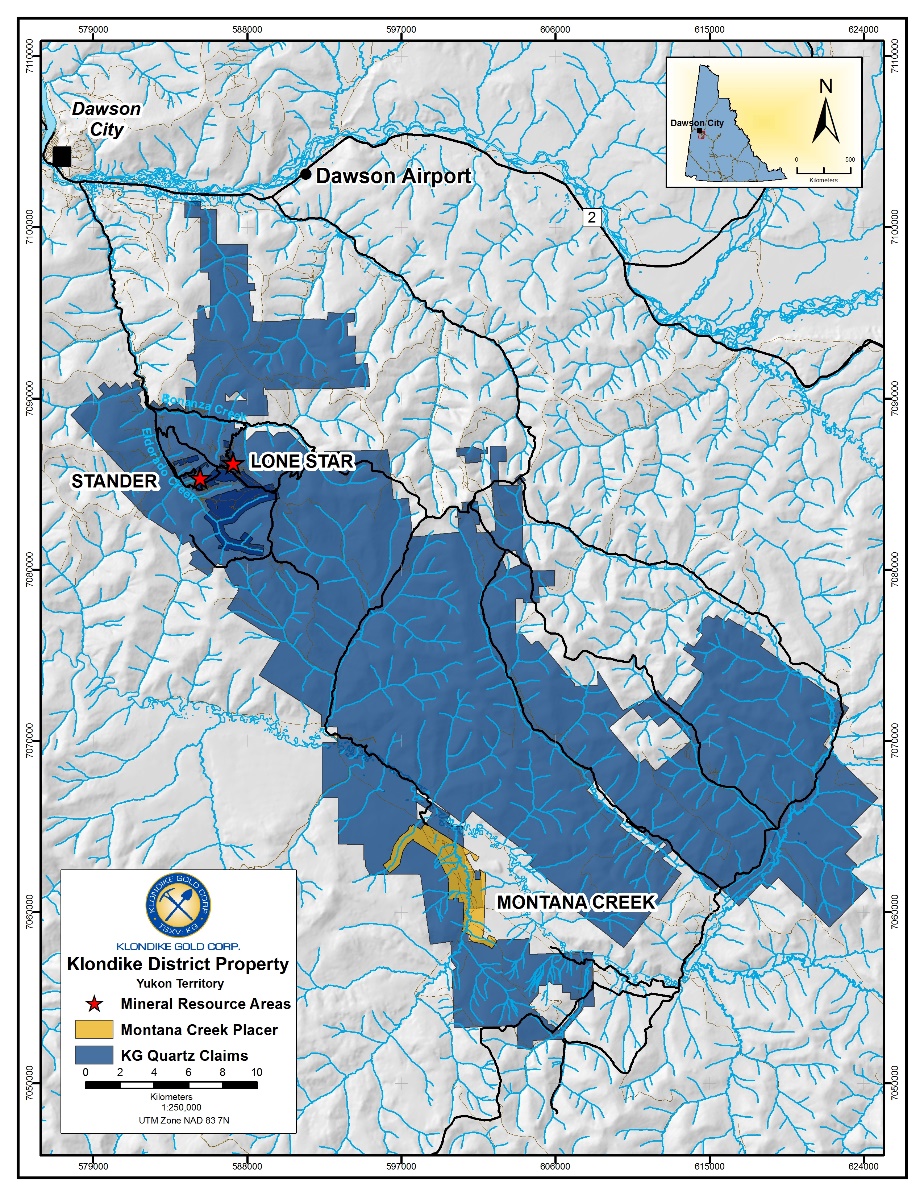 Figure 1: Location of Montana Creek placer property in relation to Klondike Gold's bedrock gold 729 square kilometer "Klondike District Project".