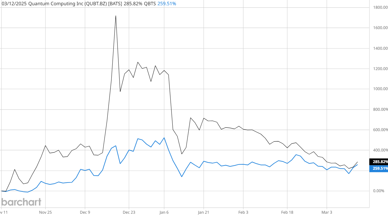 QUBT stock is climbing alongside industry peer D-Wave Quantum (QBTS), which published a paper today that its CEO Alan Baratz described as a “demonstration of quantum computational supremacy.” QBTS stock is up 9.4% on the news.
