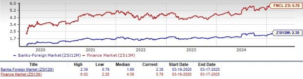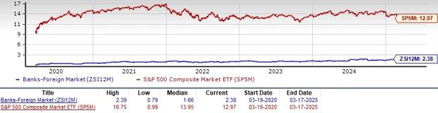As finance stocks typically have a lower P/TBV ratio, comparing foreign banks with the S&P 500 might not make sense to many investors. However, a comparison of the group’s P/TBV ratio with that of its broader sector ensures that it is trading at a decent discount. The Zacks Finance Sector’s trailing 12-month P/TBV of 5.78X and the median level of 4.56X for the same period are above the Zacks Foreign Banks Industry’s ratios.