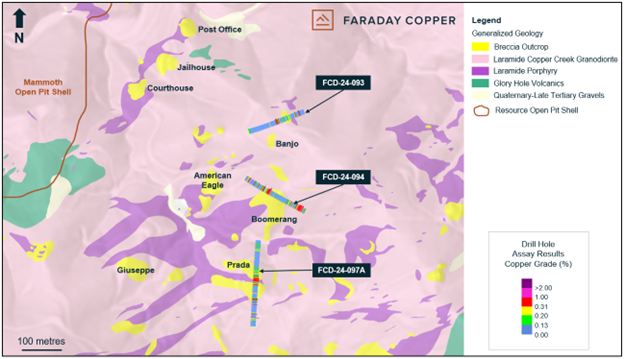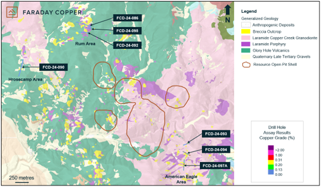 Note: The open pit shell and underground footprint are based on constraints used in the MRE as presented in the Copper Creek Technical Report1. For drill holes not reported herein, refer to news releases on the Company's website at www.faradaycopper.com and on the Company's SEDAR+ profile at www.sedarplus.ca.