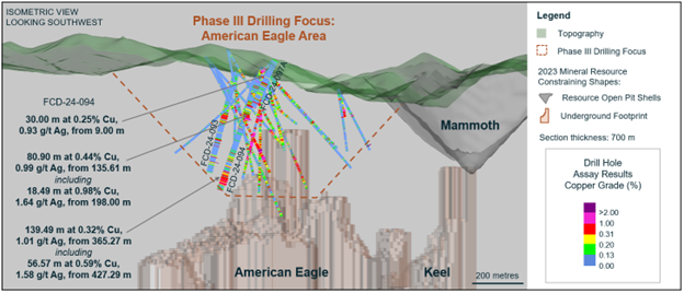 Phase III drilling commenced in October 2023 and has been focused on near-surface mineralization in new targets, primarily within the American Eagle area.