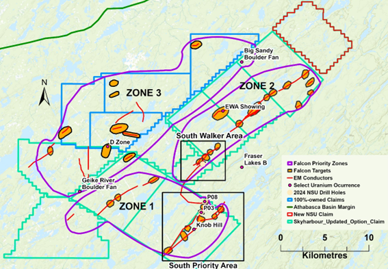 To date, North Shore has identified 36 uranium targets at Falcon. These targets are associated with electromagnetic ("EM") conductor anomalies which are often upgraded by other favourable geophysical and structural features. They were selected based on the analysis and interpretation of multiple datasets by North Shore and its consultants. As reported on May 16, 2024, the Company discovered near-surface uranium mineralization at two drill targets, P03 and P08 in an area that had never seen drilling (Figure 1). In a February 27, 2025, news release, North Shore stated that its near-term priority is to assess the potential for an economic uranium deposit in the southeastern portion of the property by evaluating priority near-surface EM targets in the South Priority and South Walker Areas (Figure 1).