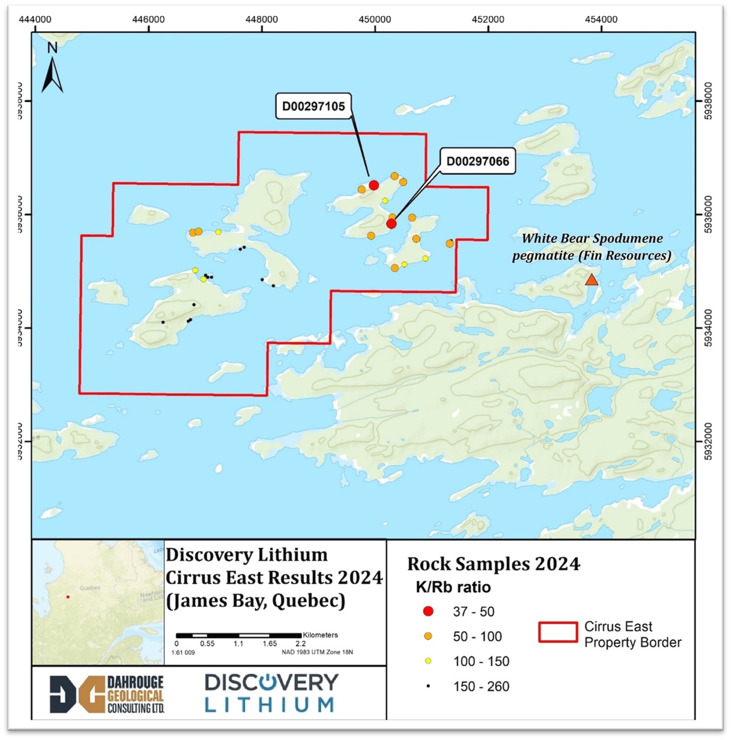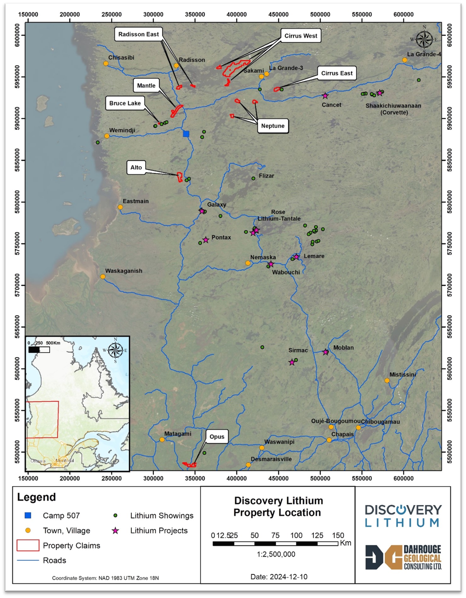 VANCOUVER, BC / ACCESS Newswire / March 20, 2025 / Discovery Lithium Inc. ("Discovery" or the "Company") (CNSX:DCLI.CN)(OTC-BB:DCLIF)(FRA:Q3Q0)(WKN:A3EFKA), a Canadian exploration company advancing domestic energy freedom through regional lithium discovery, is pleased to announce the results of its 2024 Fall exploration program on its properties in the Eeyou Istchee James Bay region. These eight properties (Figure 1), acquired earlier in 2024 (see press releases dated June 6 and August 14, 2024), were targeted for their lithium-cesium-tantalum (LCT) pegmatite potential.
