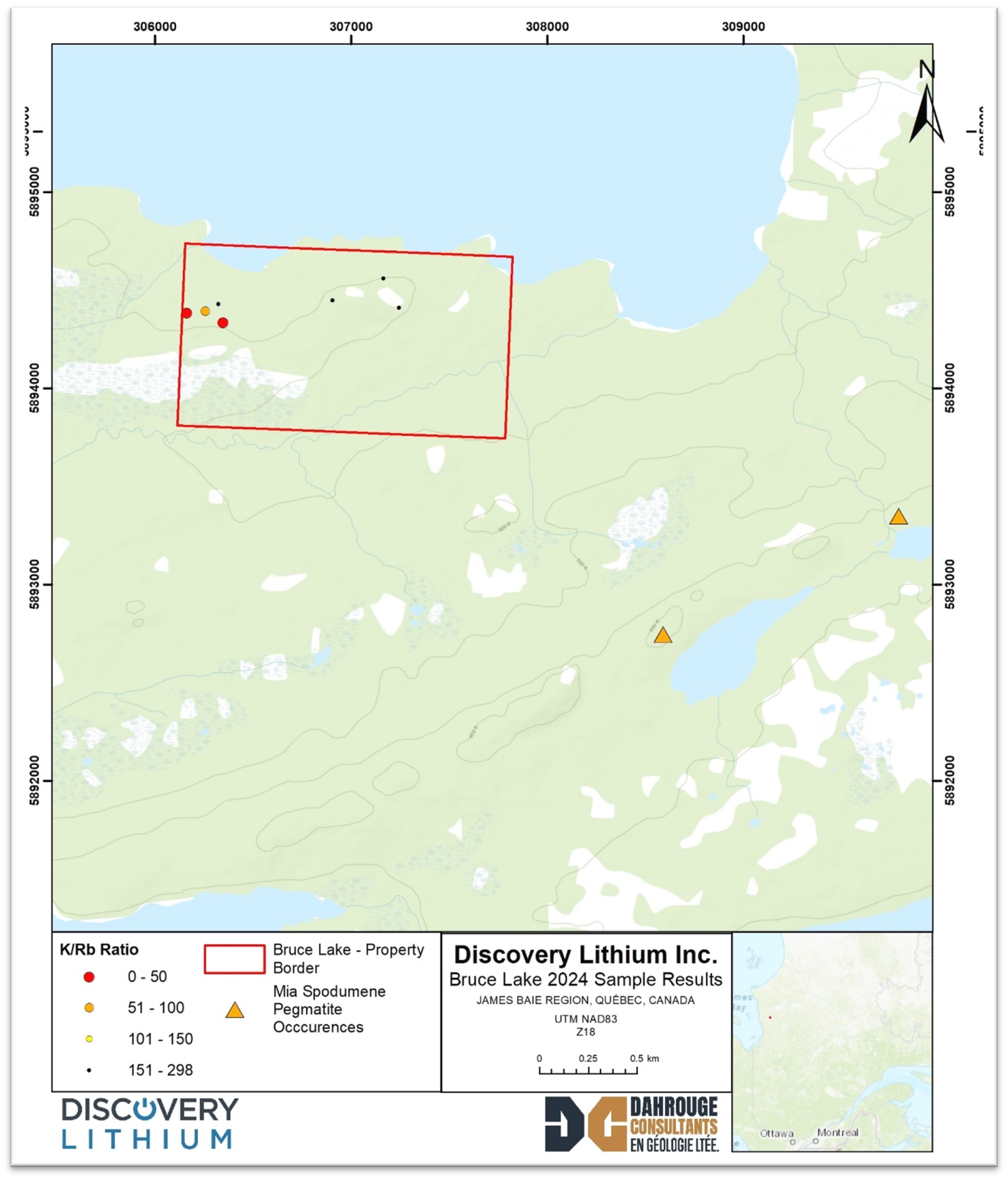 The Bruce Lake Property is adjacent to Q2 Metals' Mia Lithium project. During the 2024 Fall program, three pegmatite samples were collected from the western portion of the Bruce Lake Property (Figure 2). These pegmatites form dykes up to three meters wide and contain quartz, feldspar, garnet, and muscovite. The dykes are injected into the granodiorite of the Duncan Suite, indicating a favorable lithology for hosting LCT pegmatites, in addition to the volcanic rocks of the Yasinski Group. The three sampled pegmatite dykes returned favorable K/Rb ratios (<62), linking them to a highly differentiated magma, characteristic of LCT pegmatites.