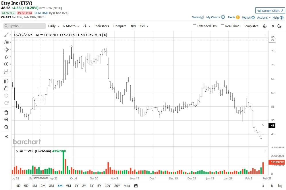According to Barchart, the put-to-call ratio on options contracts expiring early March sits at 4.56x currently, indicating significant skew to the downside. The lower price of $43.83 on those contracts suggests Etsy could lose nearly 9% over the next few weeks.