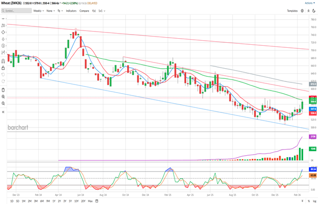 So far this week, May Wheat has gained 18 ¼ cents, nearly doubling last weeks gain of 9 ½ cents. If we close the week here, this would be the highest weekly close since the first week of April last year. The 5- and 10-week moving averages (blue/red) made a bullish crossover the first week of this month. That is a strong bullish sign, in my opinion, but the past 2 bullish crosses only lasted 4 weeks and we’re into week 3 of this one. Those weekly averages are at 5.47 ¾ and 5.36 5/8, respectively. The 50-week average (green, 5.71 5/8) seems to have offered resistance throughout it’s life on this chart, but we haven’t quite gotten there to test it this time around. If that average is tested again, that would mark the 4th attempt by my count, measured by a weekly close above that average. Perhaps the 5th time will be the charm for the bulls. The 100-week average (grey, 6.12 3/8) is still well above the market and should be a hedge target for producers out there, I think. Weekly Stochastics (bottom sub-graph) are just starting to get into overbought status by ½ of the metric. We’ll have to stay tuned to see if it reaches fully overbought, a condition this market has not liked over the 2+ years shown on the chart. The weekly chart is showing signs of a bullish turn, but more confirmation is needed, I think, before I would turn into a full-on Wheat bull. You might notice the 2 red trendlines that I’ve drawn on the chart above. The closest is drawn off highs in September ’24 and June ’25. Today, I’d peg that trendline at about 5.95, just shy of the big, fat round number of 6.00.