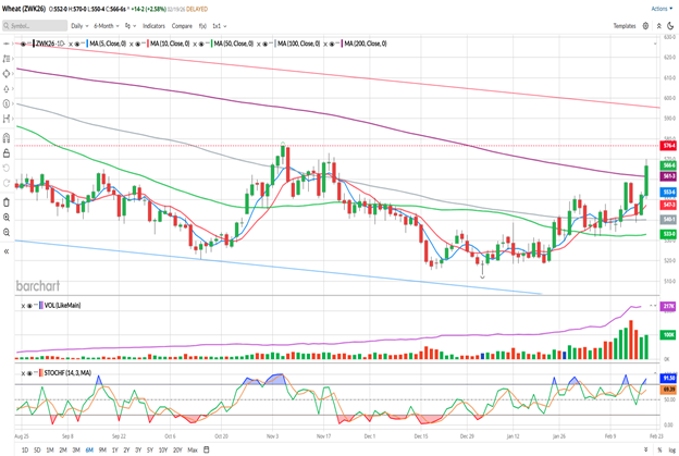 May Wheat settled at 5.66 ¾ today, up 14 ¼, gaining 2.58% on the day and leading the Grain/Soy markets higher. This marks the highest close since November 18th. This market closed strong, with the daily high being set in the last 5 minutes of the trade today. Today’s close also marks the first close above the 200-day moving average (purple) since June 18th, which can be a strong signal of trend. The 5- and 10-day moving averages have held as support so far this week and are at 5.53 ¾ and 5.47 3/8, shown in blue/red, respectively. Those 2 averages made a bullish crossover one week ago and are pointed higher. The 100-day average (grey, 5.40 ¼) has acted as support since February 11th and appears to be flattening out. The 50-day average (green, 5.33) also appears to be flattening this month. Those two averages are still in a bearish configuration, and have been since May of last year. As you might surmise, it may take a while (and more price strength) to get those to turn bullish. But overall, the chart is showing signs of bullish life!