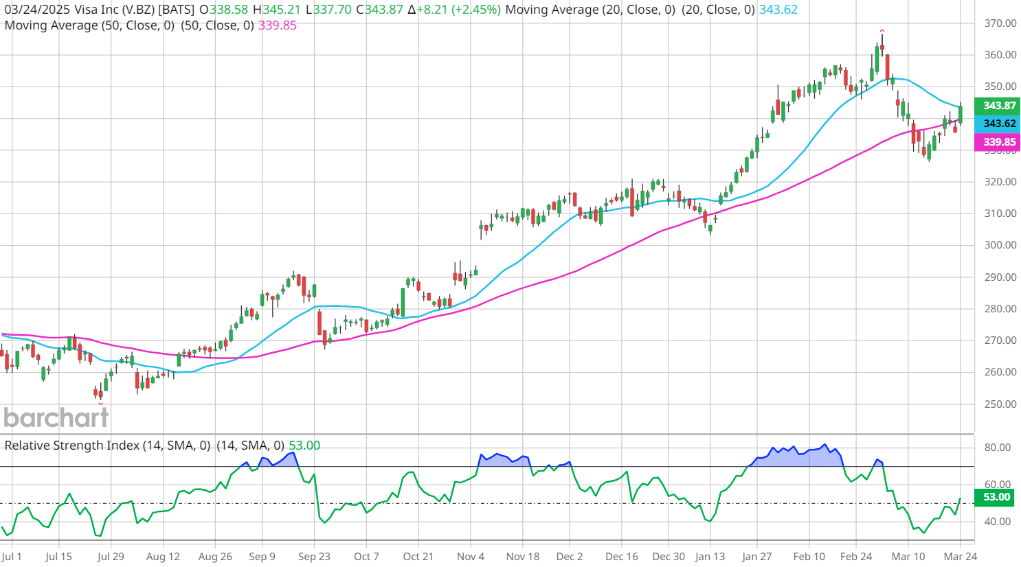 Today’s gain continues the positive momentum in V stock so far this year, with shares up 9.1% in 2025. That outperforms a decline of about 2% for the broader S&P 500 Index ($SPX) over the same time frame. After today’s advance, the stock is looking to reestablish a foothold above both its 20-day and 50-day moving averages.