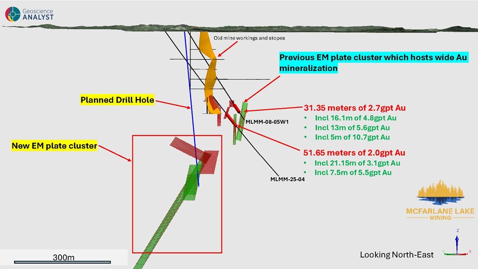 Based on the recent drill results and the new bore hole EM geophysical targets, McFarlane's technical team believes the EM plates could represent an extension of the gold mineralization plunging steeply to the northwest. In the coming days, the company plans to drill test the newly identified EM plates on the unexplored west side of the McMillan Mine.