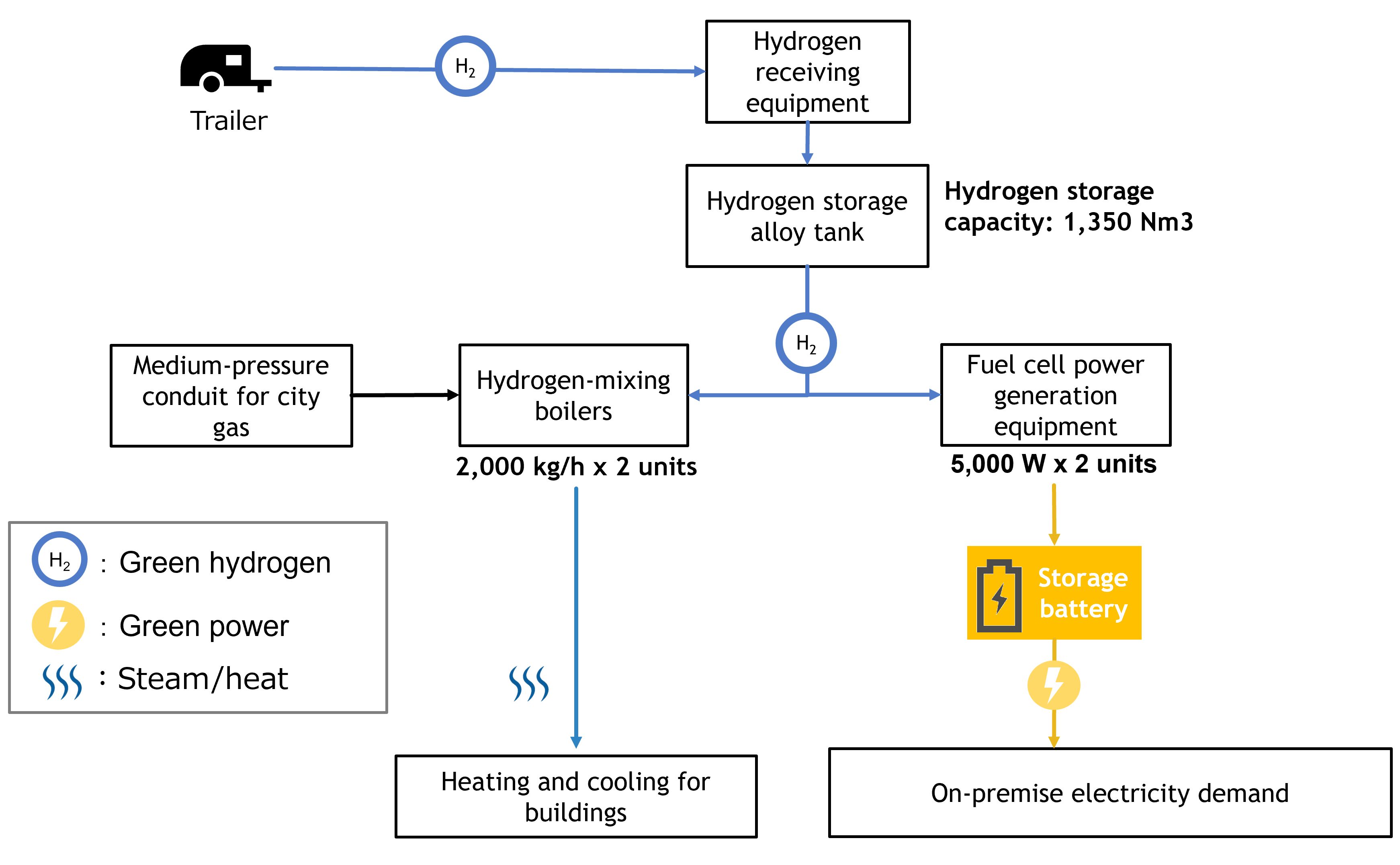Green hydrogen produced in Japan using renewable energy is transported by trailer to the Akasaka area of Tokyo, where it is stored in hydrogen storage alloy tanks manufactured by Shimizu Corporation and used as fuel for fuel cells and boilers.