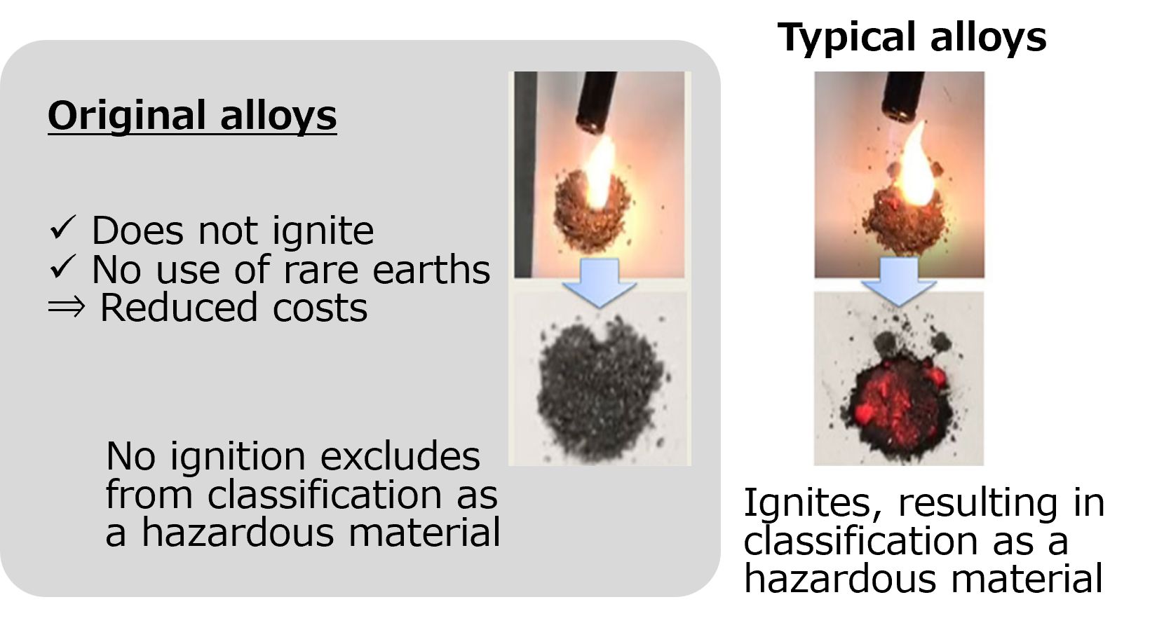These are safe and compact hydrogen storage alloy tanks, capturing the benefits offered by hydrogen adsorbed on a special alloy to reduce hydrogen gas volume to 1/1000 of its original volume for storage. Unlike conventional liquefied hydrogen tanks and high-pressure containers, hydrogen adsorbed on hydrogen storage alloys is handled at a low pressure of less than 1 MPa, and the use of non-hazardous alloys that do not ignite when placed near fire ensures safety for installation inside buildings. In addition, these rare earth-free alloys contribute to cost reductions.