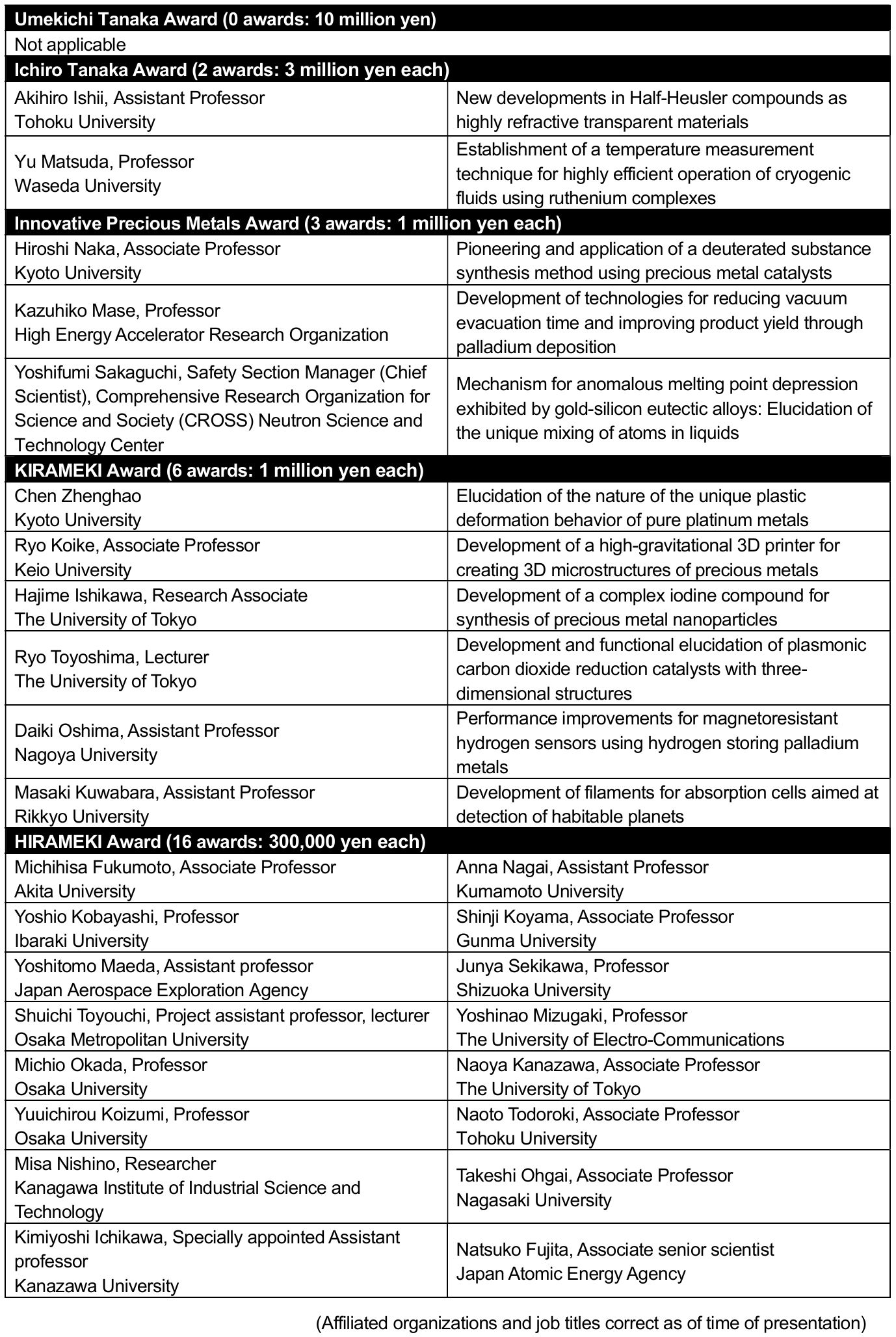 | HIRAMEKI Award (Previously TANAKA Special Award) | 300,000 yen |