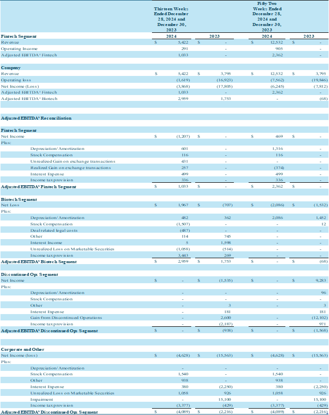 October 2024: Board approved the separation of the Company's Fintech and Biotech segments into two independent entities. The Biotech entity (Alyea Therapeutics Corporation or "Alyea") commenced funding in Q4 and is pursuing plans for a future independent listing.