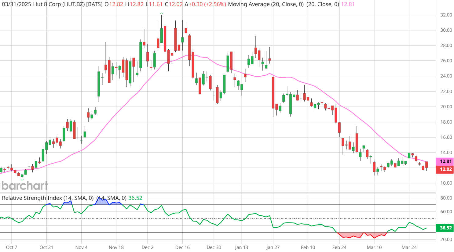 Despite a generally bearish bias in today’s session, the market has responded favorably to this development, with HUT stock up more than 2% this morning. However, like its crypto peers, Hut 8 has underperformed in 2025, and is still down 42.7% on a year-to-date basis. The stock’s momentum today is stalling out near its overhead 20-day moving average.