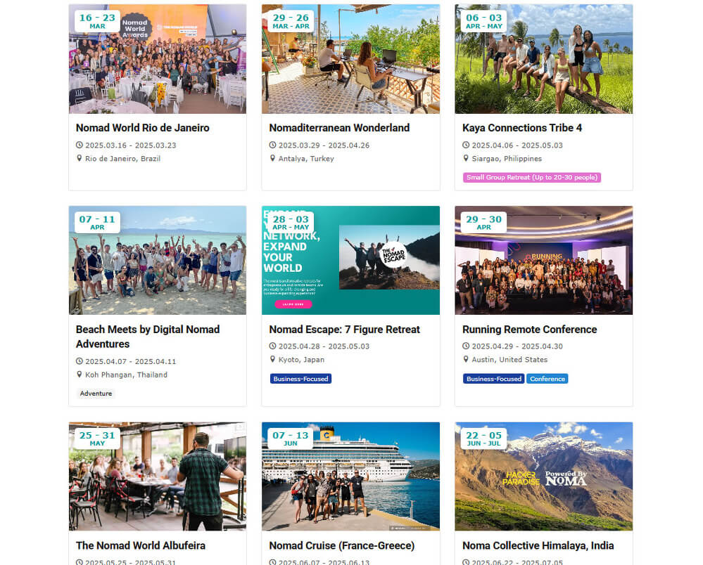 The calendar already includes major nomad conferences and festivals taking place in 2025, as well as various coliving experiences and retreat programs With the digital nomad ecosystem expanding rapidly, the calendar will continue to grow and evolve to keep up with global trends.