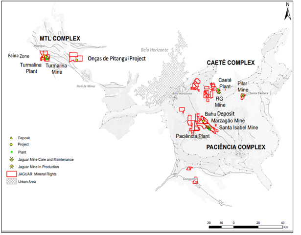 Proven and Probable Mineral Reserves and Measured, Indicated and Inferred Mineral Resources figures are reported for the Company's two operating mining and production complexes, MTL and Caeté, and for the Paciência complex (currently on care and maintenance) in the Iron Quadrangle Gold Province, Minas Gerais, Brazil. The MTL complex (currently suspended) is comprised of the Turmalina mine (orebodies A, B and C), the Faina zone, the Onças de Pitangui project as well as the Zona Basal and Pontal deposits. The Caeté complex is comprised of the Pilar mine (orebodies BA, BF, SW, LPA and TORRE), the Roça Grande mine (on care and maintenance) and the Córrego Brandão open-pit deposit. The Paciência complex is comprised of the Santa Isabel and Margazão mines (both on care and maintenance) and the Bahú deposit.