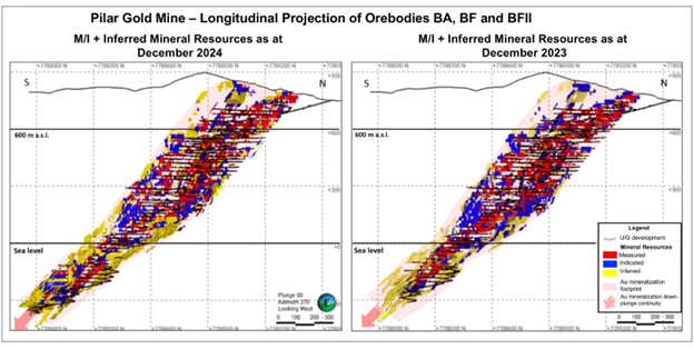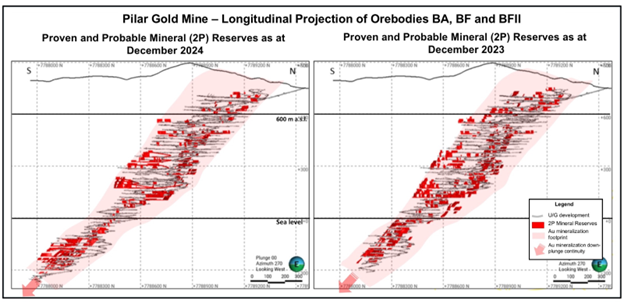 Figure 6. Long Section showing year-over-year changes in Pilar mine Mineral Reserves 2024 vs 2023