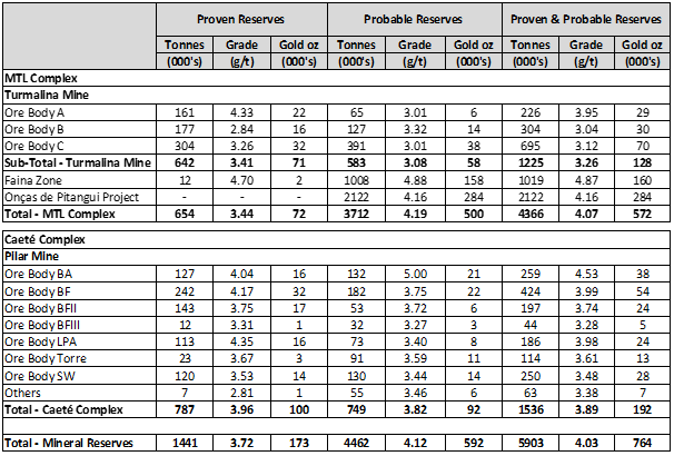 NI 43-101 Technical Report - Turmalina Mining Complex, Minas Gerais, Brazil, by SLR Consulting (Canada) Ltd. (SLR), includes an update of Probable Mineral Reserves totalling 284 koz (2,122kt @ 4.16 g/t Au) at the Onças de Pitangui project.