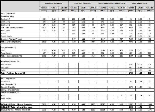 3. Mineral Resources are inclusive of the Mineral Reserves at the Turmalina and Pilar mines, the Faina zone and Onças de Pitangui project.